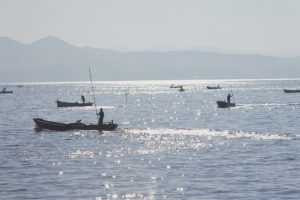 湖にはしじみ漁の船が浮かび、