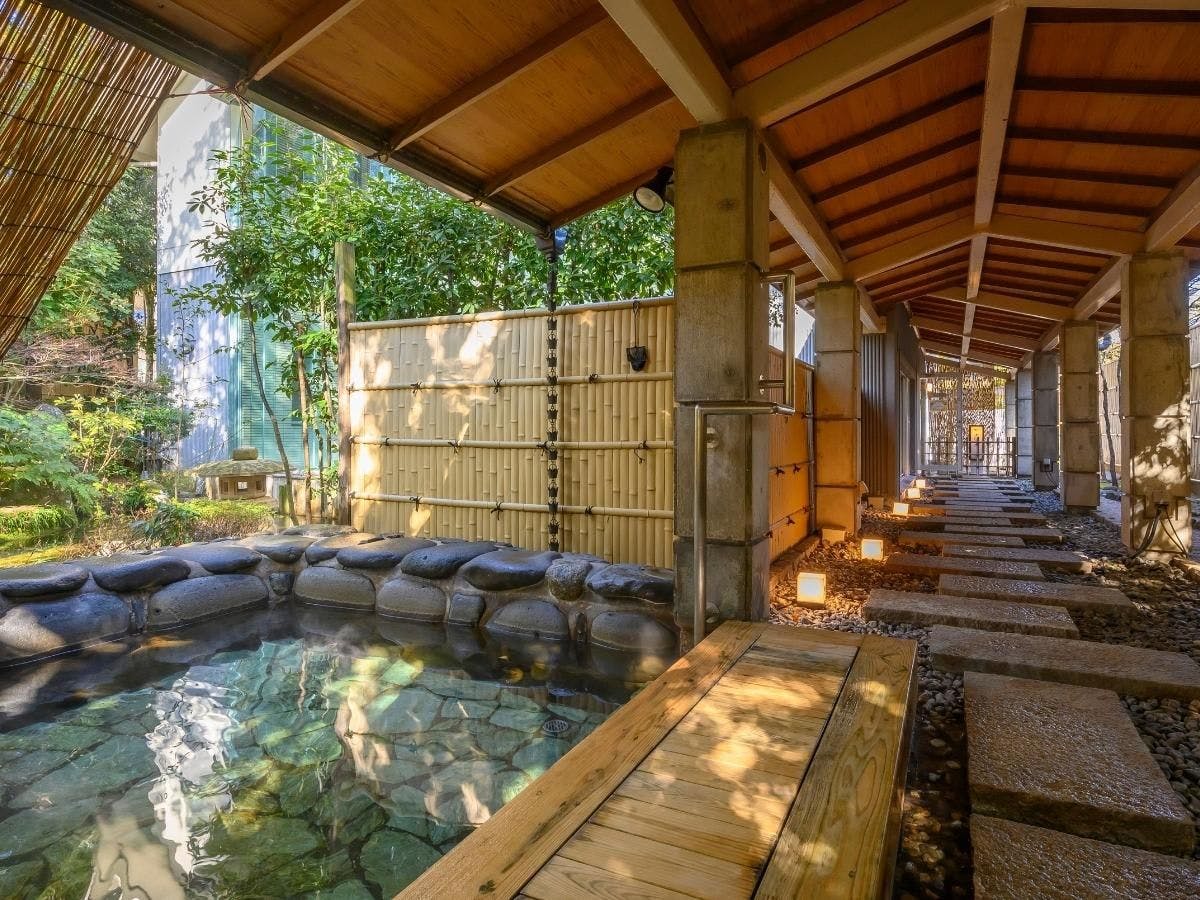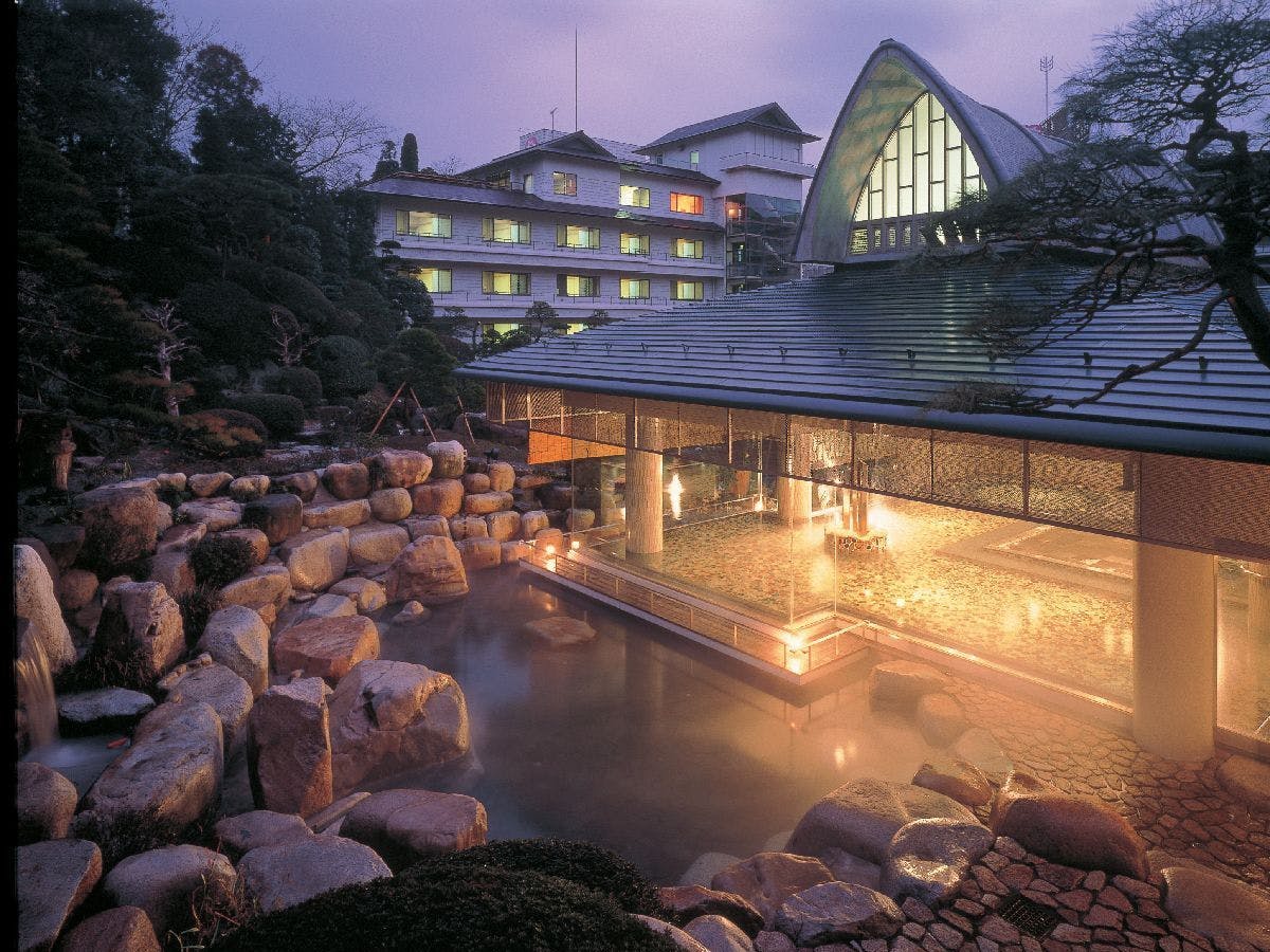 日本最大級ともいわれる広さの混浴露天風呂「龍宮の湯」、1万坪の日本庭園が有名です。